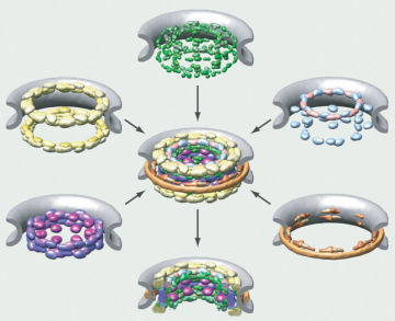 Alber and his colleagues at UCSF and Rockefeller University in New York used different kinds of data to place constraints on where each protein could be located relative to other proteins. For example, the researchers repeatedly fragmented the complex into small pieces, and then observed which clumps of proteins remained tightly bound to identify adjacent proteins. And electron microscope images of an entire pore revealed its overall shape. Altogether, the scientists amassed about 10,000 constraints on the proteins’ locations.
