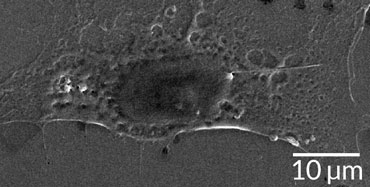 REACH OUT AND TOUCH A membrane tendril stretches from a human cell to wrap around a silicon nanowire — the start of phagocytosis, this scanning electron microscopy image suggests.