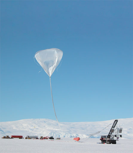 The South Pole has been a point of convergence for teams studying cosmic rays over the last decade, thanks to its built-in icy reflector and seasonal winds. While some detectors are buried beneath the ice, others fly far above the frosty landscape in balloons lofted high into the atmosphere by a polar vortex that begins churning sometime around November. Carried by these winds, the balloons circle the icy pole, easily remaining airborne for weeks at a time, a far cry from Hess’ six hours.