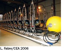 Sea: Whether liquid or frozen, water is useful for detecting cosmic rays. Energetic particles interacting with water produce a spark of light that can be measured — hence Auger’s water tanks. But some scientists have taken that method of detection one step further and submerged entire telescopes. Similar to IceCube in design, the ANTARES neutrino telescope (shown before deployment) lives in the Mediterranean, off the French coast. Not all detectors are so lucky, though. The Baikal Deep Underwater Neutrino Telescope has been submerged for years in the frigid Siberian lake.
