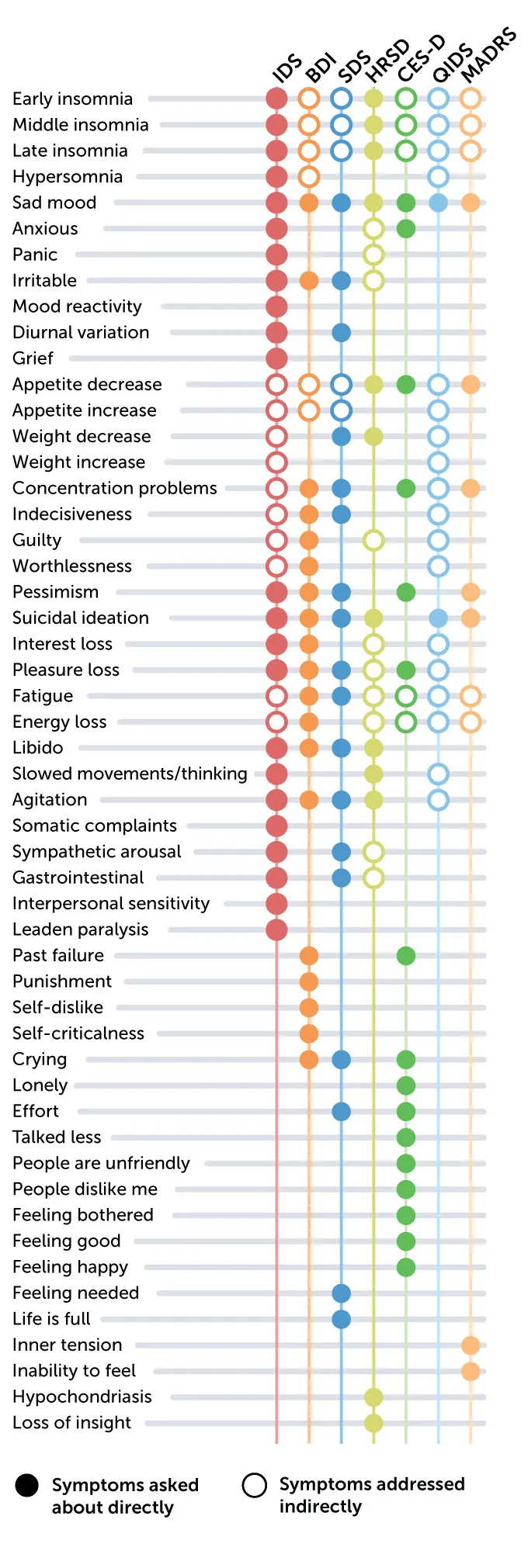 Seven common rating tools for depression measure a wide variety of symptoms. When researchers reviewed the 52 symptoms measured by these scales, only one specific symptom appeared in all seven — sad mood.