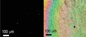 The chemical group chosen also selectively binds a type of airborne molecule, even when that molecule is present in low concentrations. The incoming molecules supplant the liquid crystals by attaching more strongly, says Abbott. Displaced liquid crystals reorient on the corrugation, and a telling change in hue results.
