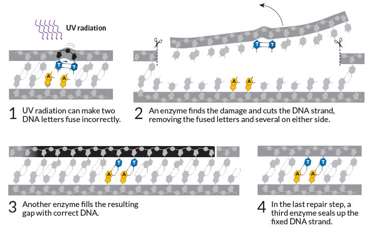 In 1983, Sancar described the first step of a third DNA repair mechanism, called nucleotide excision repair, that fixes damage from ultraviolet light. He identified three bacterial proteins that slice out short sections of DNA with inappropriately fused letters. He later outlined the next steps of repair: enzymes fill the blank spots with fresh letters and then seal up the gap. Similar versions of the repair kit are at work in all organisms, although more proteins are involved in humans.