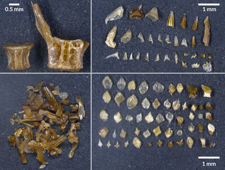 Bits of fossilized fish, painstakingly sorted from sediment, give new clues to Earth’s climate after the Chicxulub impact. The debris is made up of bones (top left), teeth (top right) and scales (bottom right). A jumbled mix of pieces is also shown (bottom left).