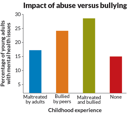 Mental health problems affected 15 percent of British participants who had not been bullied or maltreated. That figure reached 17 percent in cases of maltreatment only, 24 percent when only bullying had occurred and 28 percent for those who had been maltreated and bullied.