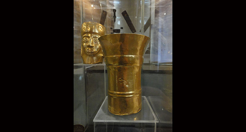 TRADER’S CUP An ancient desert cemetery in Chile contains members of an elite group of locals and outsiders who handled the distribution of goods from a regional trading network, a new study suggests. One of these trade specialists, a foreigner, was buried with these gold drinking vessels, one decorated with a human face.