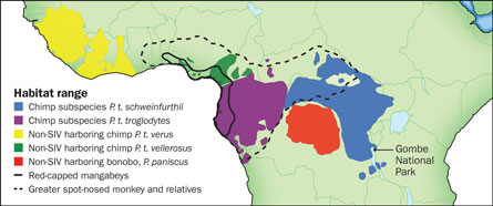 The sick chimps are from a population of the chimp subspecies Pan troglodytes schweinfurthii that live in Gombe National Park in Tanzania. Of the four subspecies of chimpanzees, only two are known to harbor the chimp version of SIV, dubbed SIVcpz. The other subspecies that carries the virus, Pan troglodytes troglodytes lives west of this region. It is from this second subspecies that SIV is believed to have jumped to humans on three separate occasions, yielding three subtypes of HIV-1. One of these subtypes is responsible for a majority of cases of AIDS in humans.