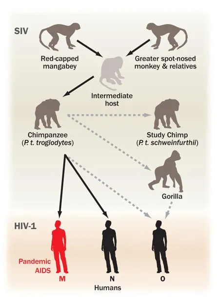 There are more than 40 different simian immunodeficiency viruses, each with a specific, nonhuman primate host. In most cases, illness is rare. Previous research on the SIVcpz strain suggests that it evolved in a chimp from a chimeric mix of lentiviruses from the red-capped mangabey, the greater spot-nosed monkey and perhaps other closely related species. How the viruses are passed along depends on the host — biting and wounds may be the primary route among nonhuman primates, although eating infected meat may also play a role.