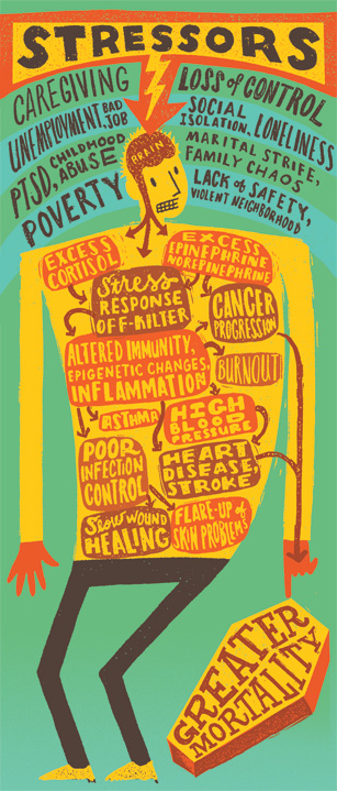 Problems arise, however, when stress becomes a feature of daily life. Chronic stress is the kind that comes from recurring pain, post-traumatic memories, unemployment, family tension, poverty, childhood abuse, caring for a sick spouse or just living in a sketchy neighborhood. Nonstop, low-grade stress contributes directly to physical deterioration, adding to the risk of heart attack, stroke, infection and asthma. Even recovery from cancer becomes harder.