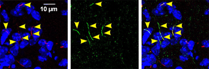 Proteins called ADCY3 (red; yellow arrows for emphasis) and MC4R (green) can be found in the primary cilia of nerve cells (nuclei are blue) known to be involved in appetite control. Together, the proteins (yellow in composite image) may be involved in obesity.
