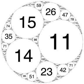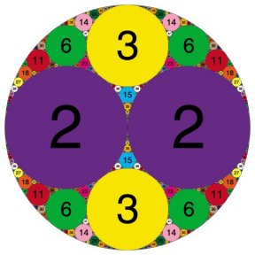 Wilks decided to use a computer to plot a large diagram of the circle pattern, labeling each circle with its curvature. “It makes a pleasing picture,” Wilks says. “It’s symmetric, and the numbers get bigger as the circles get smaller.”