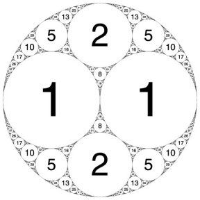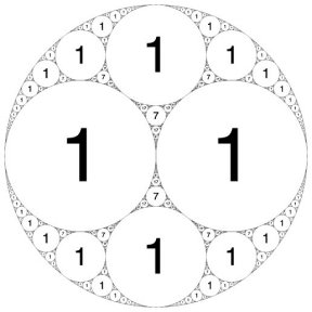 example of an Apollonian packing—a type of arrangement named after a Greek mathematician who studied tangent circles more than 2,000 years ago. Such an arrangement is created by repeatedly filling the spaces between touching circles with smaller touching circles. In Wilks’ case, the Apollonian packing was made up of circles with integer curvatures.
