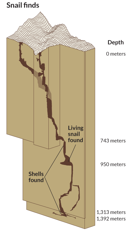 A living snail of the new species was found 800 meters below ground and shells of the animals were found almost 1,400 meters down. Jana Bedek, HBSD, Adapted by S. Egts