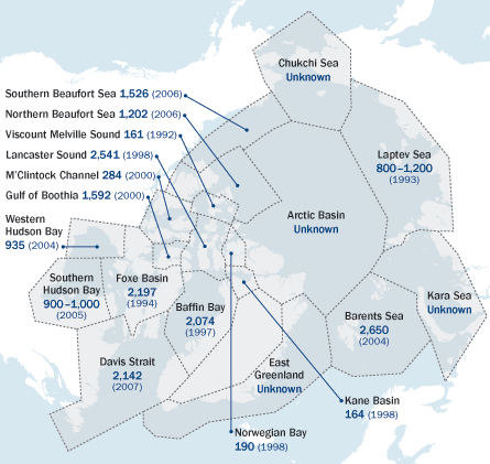 The International Union for Conservation of Nature puts polar bears into 19 subpopulations. Shown are estimated numbers of bears in 15 of the groups with years of the estimates