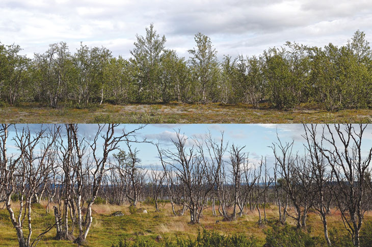 In northernmost Norway, Sweden and Finland in the mid-2000s, successive bursts of geometrid moths defoliated 10,000 square kilometers of mountain birch forest — an area roughly the size of Puerto Rico. The outbreak was one of Europe’s most abrupt and large-scale ecosystem disturbances linked to climate change, says Jane Jepsen, an Arctic ecologist at the Norwegian Institute for Nature Research.