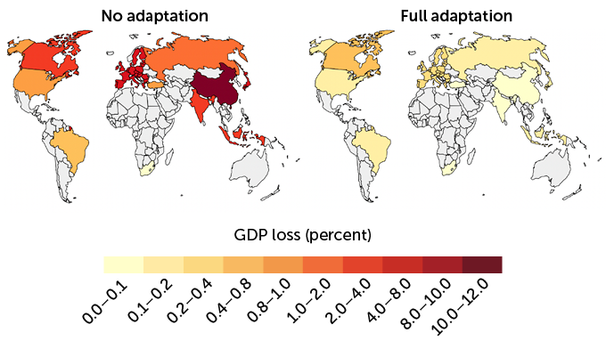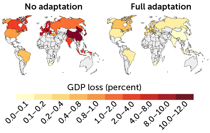 Economic losses from sea level rise could be steep (left), averaging more than 4 percent of annual global GDP by 2100 if countries continue emitting greenhouse gas emissions at current levels and don’t prepare and adapt to a world with rising seas, new research suggests. China’s losses, for example, could be up to 12 percent of annual global GDP, and Europe’s losses could reach 6 percent. But if coastal communities adapt, those annual economic losses could be limited 0.4 percent of global GDP or less.