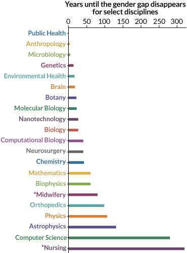 In 87 of the 115 disciplines analyzed, male authors significantly outnumber female authors. Women exceed men in only five fields, including nursing and midwifery. Some fields such as physics, mathematics and chemistry have the fewest number of women authors and would take the longest to reach gender parity. It will take about 131 years to close the gender gap in astrophysics, for example, and about 60 years in mathematics, the researchers estimate.