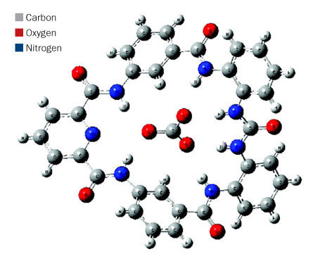 Though the carbonate isn’t chemically bonded to the macromolecule, spontaneous absorption of carbon dioxide from the air suggests that the combination is very stable, Tossell says. Theoretical analyses show the macromolecule is a giant ring composed mostly of ring-shaped subcomponents and that the negatively-charged carbonate ion nestles within the positively-charged center of that macromolecule, he notes.