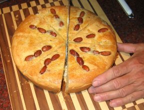 Made from flour, eggs, butter, sugar, orange flavoring, and other ingredients, this special round cake also contains a surprise—a foil-wrapped coin. In some recipes, the coin is added to the batter before baking; in others, it’s slipped under the cake when the cake is placed on a serving platter.