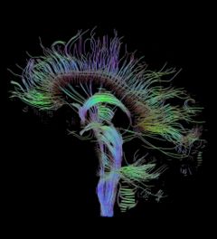 DTI (which stands for diffusion tensor imaging) measures how water flows in the brain. Within certain brain tissues, or nerve fibers, water flows more freely in one direction than the other. This is especially true in a type of nerve fiber, or axon, that carries messages from brain cell to brain cell. Commonly called “white matter,” these axons connect different parts of the brain to each other.