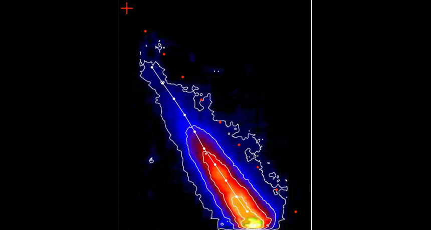 FINAL MOMENTS Comet ISON’s tail of dust (colored) separated from its nucleus (red cross, upper left) about 40 minutes before the comet’s flyby of the sun. The red dots trace the comet’s trajectory as it crossed roughly 200,000 kilometers in about 100 minutes.