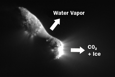 The carbon dioxide jets emanate from the rough ends of the peanut-shaped comet, while the smooth midsection vents water vapor. One possible explanation for the difference is that a layer of dust has settled in the midsection, preventing any carbon dioxide that resides there from escaping, said EPOXI scientist Jessica Sunshine, who is also at the University of Maryland.