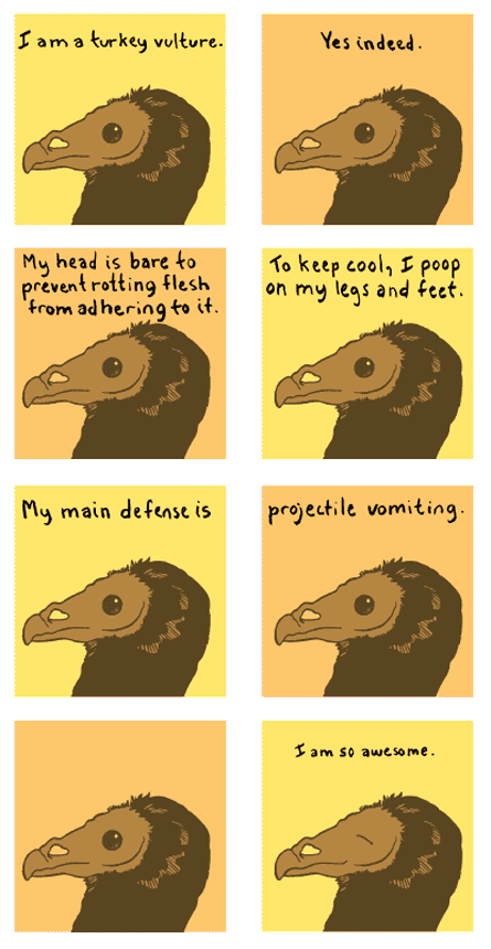 So goes the final frame in a humorous comic called “Birds are Gross,” in which artist and field naturalist Rosemary Mosco highlights the virtues of the turkey vulture. The bird, speaking throughout (“I am a turkey vulture. Yes indeed.”), reaches this conclusion after announcing its proclivities for things like projectile vomiting and poop-mediated temperature control.