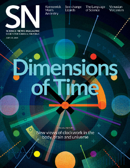 The July 25, 2015 Science News featured an in-depth look at new research on time. Andrew Grant explored why time marches forward instead of backward, Laura Sanders described how the brain coordinates a multitude of internal clocks and Tina Hesman Saey delved into the evolution of biological timekeepers.