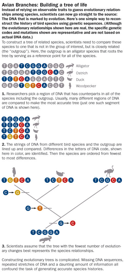Now that slow slog has quickened to an all-out sprint. Rather than divining clues to an organism’s evolutionary history from observed traits, scientists are going straight to the genetic ledger sheet. Modern tools for rapidly reading species’ DNA are laying bare those species’ genetic inheritances, the patterns of genetic code shaped by eons of mutation and natural selection. And ever more powerful computers are churning through gigabytes and gigabytes of this genetic data to decipher which species are like sisters and which are only distant cousins.