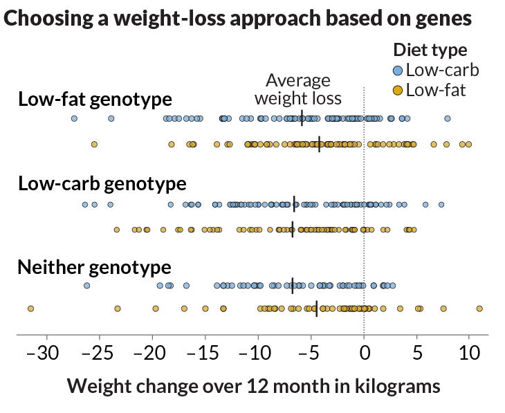 Gardner should know. He and colleagues tested whether variants in three genes involved in fat or carbohydrate metabolism could predict whether a person would be more successful at losing weight on a low-fat or a low-carb diet. The idea was based on his team’s previous study of 130 people. Those whose genetic profile matched the diet they were assigned to lost three times as much weight as those whose diets and genetics didn’t match.