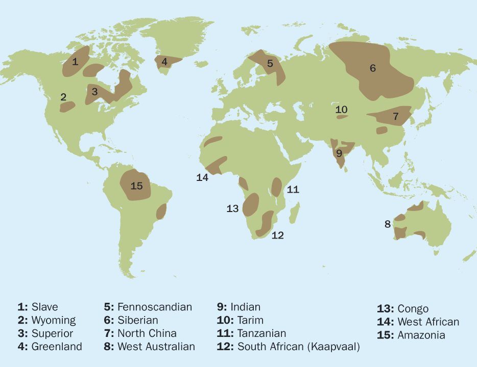 The age of the diamonds puts the birth of many cratons during the eon known as the Archean, 2.5 billion years and more ago. Some may go back close to 4 billion years, just half a billion years after the Earth’s birth. The appearance of more cratons seems to have petered out during the Proterozoic eon, which lasted until about 540 million years ago. After that, continents grew by accumulation of new and thinner, more flexible (and mountain-forming) crust.