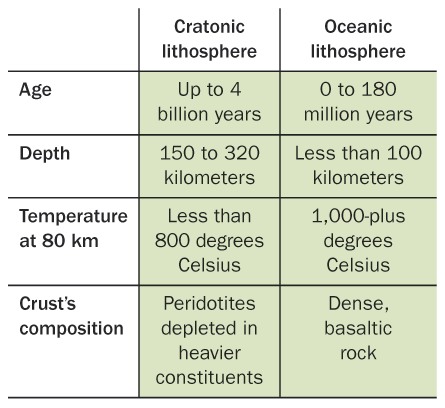 Cratons are cold, a relative term. Go down 240 kilometers in a craton and the rock, while nowhere near molten, is plenty hot — perhaps 1,300° Celsius. But one needs to go down just half as far or less to find rock so hot under the ocean floor (or even where new continental crust is forming in volcanic island chains, or in mountains thrust upward by an ocean plate squeezing its way underneath).