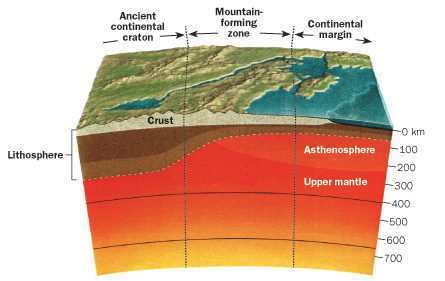 Cratons typically are two or three times as thick as oceanic lithosphere. Even mountain ranges such as the Himalayas rest on rock thinner than the low, flat cratons. While the asthenosphere into which the cratonic roots extend may sound like taffy into which a toe is dipped, it is not. “If you picked up a hot piece of the asthenosphere (with thick insulating gloves), it would be harder than steel,” says Norm Sleep, a Stanford University geophysicist. That the cratons have survived through eons has been hard to understand and, to many, still is.