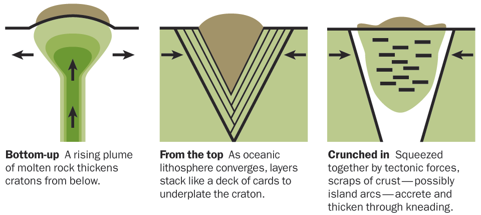 But even today great questions remain about how cratons formed. It is not at all clear that the isopycnic hypothesis in full will stand the test of time. For instance, the exact way that cratons got their keels during the distant Archean is still unclear. Three hypotheses have been proposed. One, the surface crust was thickened from directly beneath by a rising plume of semimolten material from far deeper in the Earth. Two, subducting plates of Archean oceanic lithosphere sometimes got lodged beneath cratons, one after the other in an underplating process. And, three, cratons thickened through accretion. In this case, scraps of continental-type crust, possibly island arcs newly formed at sea, could raft against cratons to thicken them or, in Jordan’s view, cratons themselves could squeeze together and thicken.