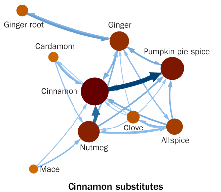 Then the team created a huge diagram of ingredients that are frequently substituted for one another, yielding a network of clustered communities of swappable ingredients. A sweet potato community, for example, includes yams, pumpkin, potatoes, parsnips and butternut squash. Milk, butter, chicken broth and sugar all have recipe doppelgangers. And in some instances, dropping ingredients all together won’t hurt a dish.