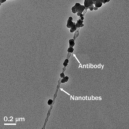 Vitetta and her colleagues coated carbon nanotubes with leukemia-specific antibodies that seek out and bind to particular molecules on human leukemia cells. They then created lymphoma-specific antibodies and did the same in human lymphoma cells. Each antibody type fits to only one kind of cancer cell, like a key fitting only one lock, Vitetta explains.
