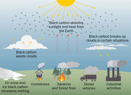 As if that weren’t bad enough, these particles also can boost temperatures by breaking up light-reflecting clouds. And even after it settles back to Earth, black carbon can continue to foster warming. Particles that land in the Arctic or the Himalayas darken ice and snow, boosting heat absorption and melting.