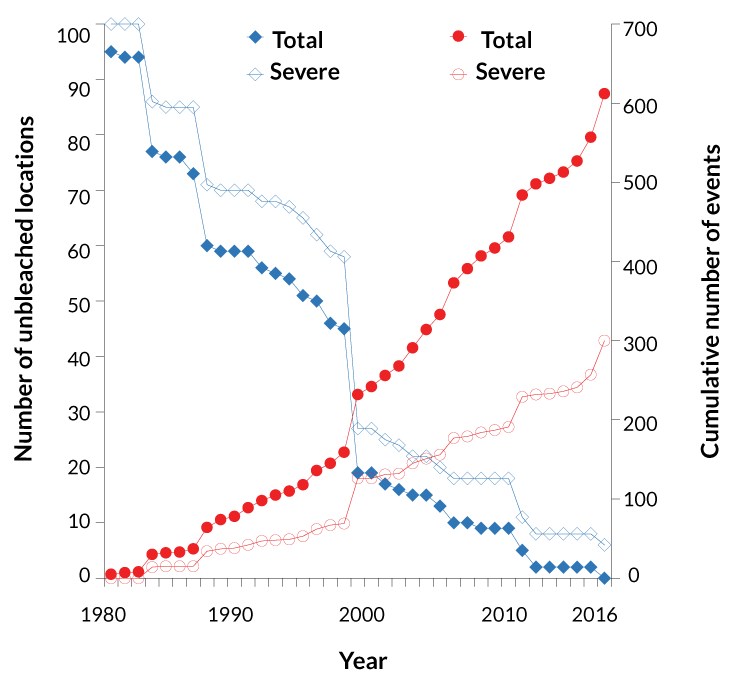COLORLESS Bleaching removes the algae that feed corals and give them their color, turning vibrant reefs barren. Reefs are now experiencing severe bleaching much more frequently than four decades ago.