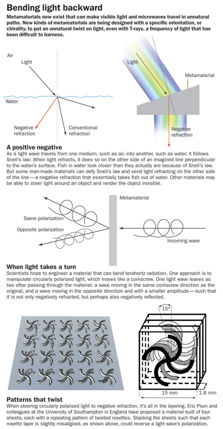 Scientists seeking to make light waves do such unnatural gymnastics have failed to find any natural material that does the job. But in recent years, physicists and engineers have been experimenting with different “metamaterials,” engineered substances that interact with electromagnetic waves in precisely controlled ways. The researchers have made swift progress: Already, they have created metamaterials that can in fact bend light backward. By reversing refraction, these new materials could essentially take a fish out of water, making it appear to float above the water’s surface. Theoretically, the materials also can, just like Harry Potter’s famous cloak, render objects invisible.