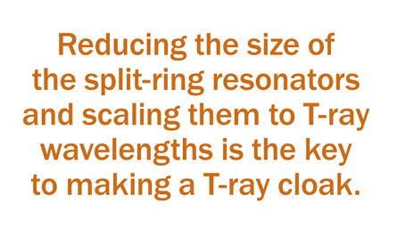 The cloak today is merely a mock-up of the invisibility cloak that Duke researchers developed for microwaves. Cloaks designed so far could only hide objects millimeters or smaller in scale. But the Boston group says that reducing the size of the split-ring resonators and scaling them to T-ray wavelengths is the key to making a T-ray cloak. Also, Tao says, the entire resonator system, the metamaterial itself, should be cylindrical rather than square. A cloaking, can-shaped device would be made from multiple concentric layers of film. So far, only a computer simulation has demonstrated that the cloak could work—with about 50 layers of film. “Our team’s not there yet,” he says.