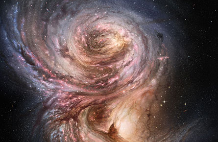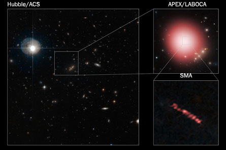 The astronomers discovered the galaxy, SMMJ2135-0102, using the submillimeter-wavelength Atacama Pathfinder Experiment Telescope in northern Chile. Follow-up observations with the Submillimeter Array on Hawaii’s Mauna Kea produced the sharp images that revealed four star-forming blobs in the galaxy. The smallest blob is about 300 light-years across, and most of the patches are about three times bigger than those in the galaxy Arp 220, a rare example of intense star formation in the universe today.