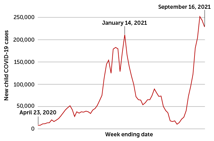 After dipping to 8,447 child cases the week ending June 24, the coronavirus has made a resurgence fueled by the delta variant. COVID-19 infections in children in the United States have reached record levels in recent weeks, peaking at 251,781 cases the week ending September 2. That peak surpasses the previous record of 211,466 cases, set the week ending January 14 in the midst of the pandemic’s winter surge. These data are from 49 states (Nebraska stopped reporting COVID-19 data at the end of June), New York City, Washington, D.C., Puerto Rico and Guam.