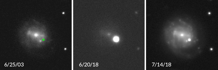 Using several telescopes, astronomers saw a cosmic flare nicknamed the “Cow” brighten and fade. The Sloan Digital Sky Survey observed the Cow’s host galaxy in 2003 (left), when the Cow was nowhere in sight. The green circle shows where the flare later appeared. Then the Liverpool Telescope saw the Cow on June 20, 2018, when it outshone the galaxy (center). The William Herschel Telescope saw the Cow about a month after its peak brightness, when the flare had faded (right).