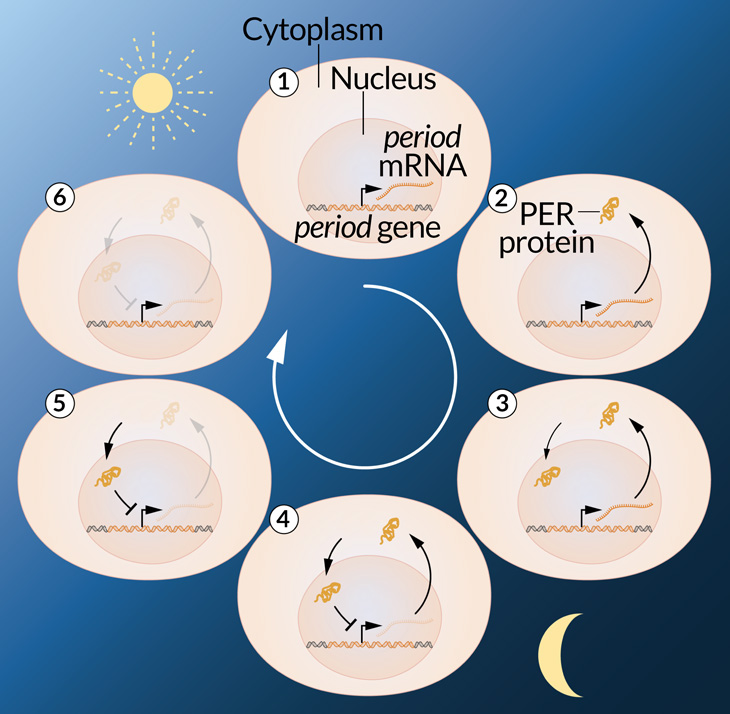 It wasn’t immediately apparent how the gene regulated fruit fly activity. In 1990, Hall and Rosbash determined that levels of period’s messenger RNA — an intermediate step between DNA and protein — fell as levels of period’s protein, called PER, rose. That finding indicated that PER protein shuts down its own gene’s activity.