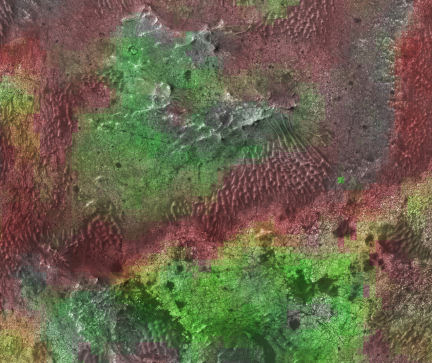 The distribution of materials in this composite image of the Nili Fossae region of Mars tells scientists that water resided there no more recently than nearly 4 billion years ago. Green indicates clay minerals that formed in a wet environment. Red depicts the mineral olivine, which formed about 3.8 billion years ago, according to the region’s cratering record.