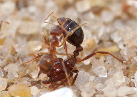 CHEMICAL ANT FIGHT The red imported fire ant (left) dabs droplets of potent venom from its rear onto enemies, but its opponent this time, a tawny crazy ant (right), detoxifies the venom with an acid rubdown.