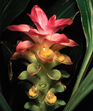 The powder comes from a broad-leafed plant that thrives in the hot, rainy climates of southern Asia. Its pinecone-shaped stalks of white, pink, and yellow flowers smell faintly of mango, and its bulbous roots resemble those of the ginger plant, to which it is closely related. Cut a root open, however, and you’ll find its fleshy interior is that vivid yellow-orange.