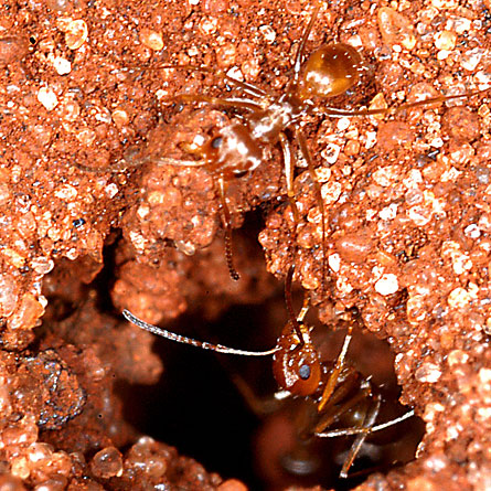 Forelius pusillus ants nest in the sandy roads that crisscross sugarcane fields near São Paulo, Brazil. During the day, the ants are very active, transporting sand excavated from the nest to a pile surrounding the entrance. But at sundown all the ants go inside, save for a handful of workers who spend nearly an hour dragging and carrying sand from the pile back to the entrance to cover it. In the entrance-closing finale, one to eight ants kick sand backward, doggy-style, until the entrance is completely obscured. Then these ants depart. In the morning the entrance is opened from the inside and the door-closers never return to the nest, the researchers report.