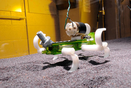 News in Brief Tech Custom-designed legs help robots speed over sand Six-legged machine runs across grainy surfaces By Meghan Rosen March 22, 2013 at 11:35 am - More than 2 years ago Share this:Share Share via email (Opens in new window) Email Click to share on Facebook (Opens in new window) Facebook Click to share on Reddit (Opens in new window) Reddit Click to share on X (Opens in new window) X Click to print (Opens in new window) Print View the videoA tricked-out robot can scurry quickly over pebbly surfaces using custom-made legs. A LEG UP A hexapod robot rests in a bed of granular material. The robot uses custom-designed legs to move quickly over pebbly surfaces.