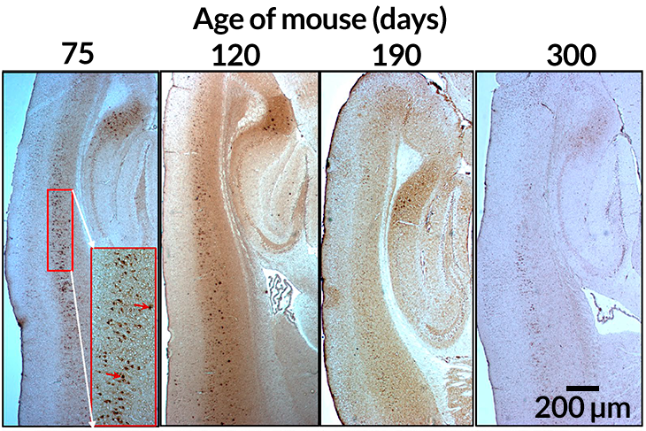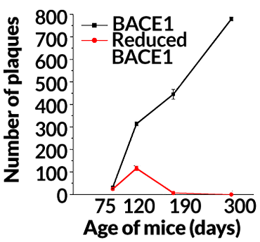 The researchers studied mice engineered to develop plaques in their brains when the animals are about 10 weeks old. Some of these mice were also engineered so that levels of the BACE1 enzyme, which is mostly found in the brain, gradually tapered off over time. When these mice were 4 months old, the animals had lost about 80 percent of the enzyme.